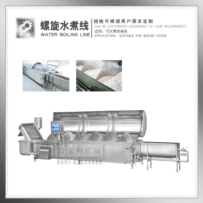 The curing equipment introduction of spiral line is applicable to a variety of boiled fish products, meat products, pasta and other cooking products stereotypes; with a large screen man-machine interface control, simple operation, intuitive display real-time situation in all aspects of product processing; can enter various formulation process, each part can be set to automatically adjust the action according to the process of feeding speed; cooking temperature and cooking temperature and time according to the setting value of automatic adjustment, accurate control; a built-in heat insulation layer, improve the utilization of steam, reduce production cost, effective production efficiency; opening and closing the box cover, a gas cylinder control, the whole process can easily check the product line can be boiled; according to different requirements of the process of multi region in combination, make the process more suitable process requirements; the whole machine adopts SUS304 stainless steel production, easy cleaning, low failure rate, maintenance. Our company can provide a variety of different configurations, the price of a variety of water lines, the combination of cooling lines and related equipment; note: touch screen, temperature control, open cover cylinder control for the G type of water injection line configuration