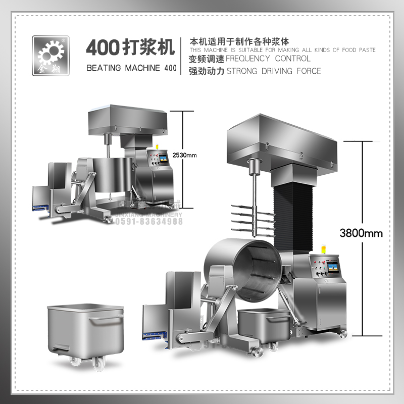 This product is made of SUS304 stainless steel shell, 16 thick inner core of main lift, 16 thick steel plate welding, double layer of bucket, polyurethane foam filling and insulation mode, the temperature of the slurry in the bucket is not easy to rise, so that the slurry produced in the bucket is more effective and can play various kinds of pulp and fish products. Meat products, with 55kW heavy load frequency converter hydraulic lifting automatic feeding, discharging function, simple operation, easy to use, reasonable design, work safety, appearance beautiful and generous, according to the user needs to customize a variety of different specifications of the beating machine.