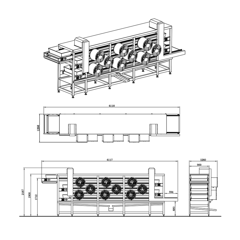 ●采用耐高温的不生锈的食品SUS304材质的网带来输送食品,食品在多层输送带上经过多层的翻身,降温风冷,在最短的时间内降温下来。