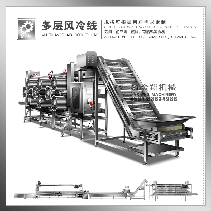 ●熟食品在加工出来都是热的,需要降温风冷输送,这就用到了多层不锈钢网带降温风冷摊凉机,
